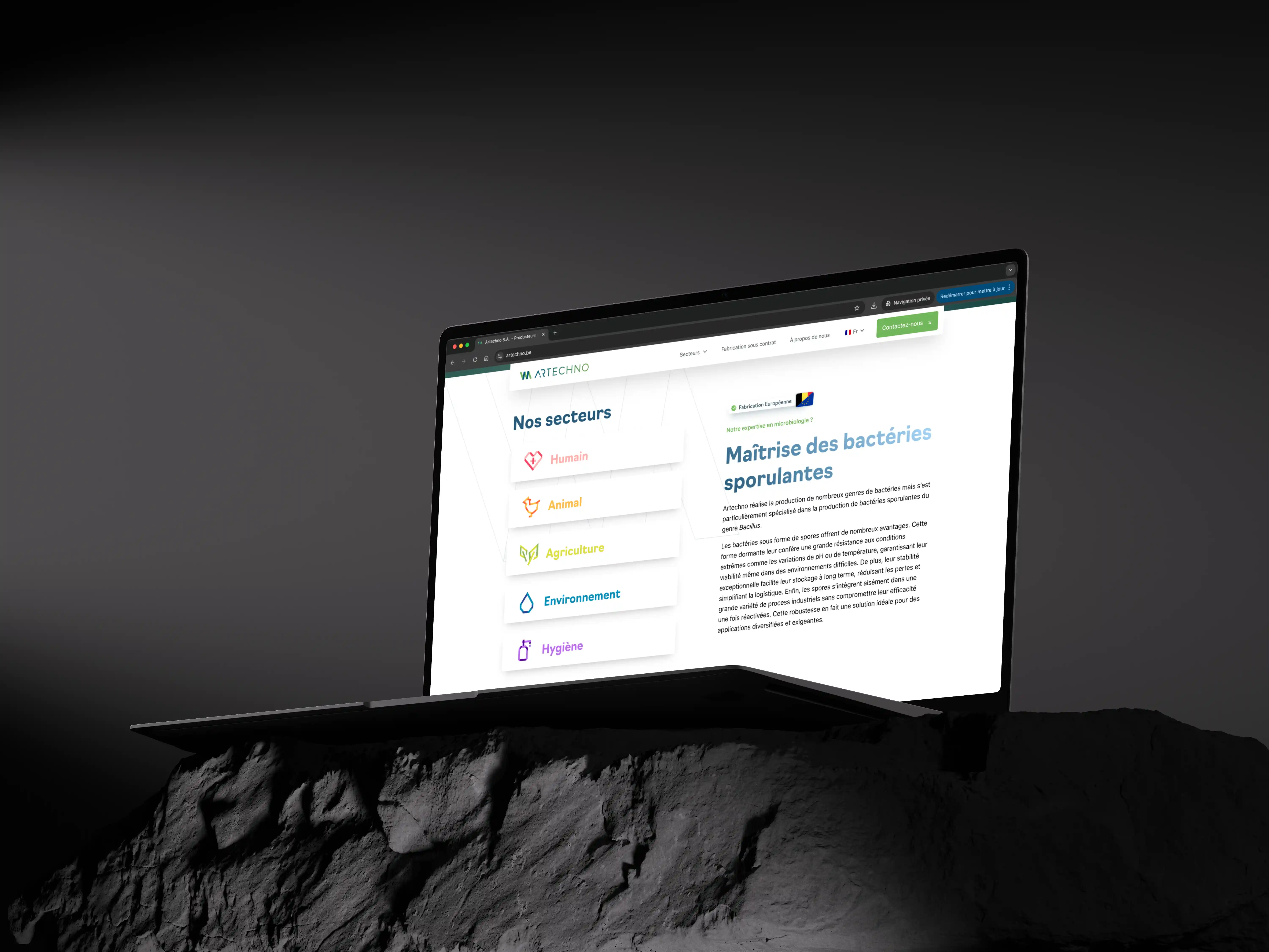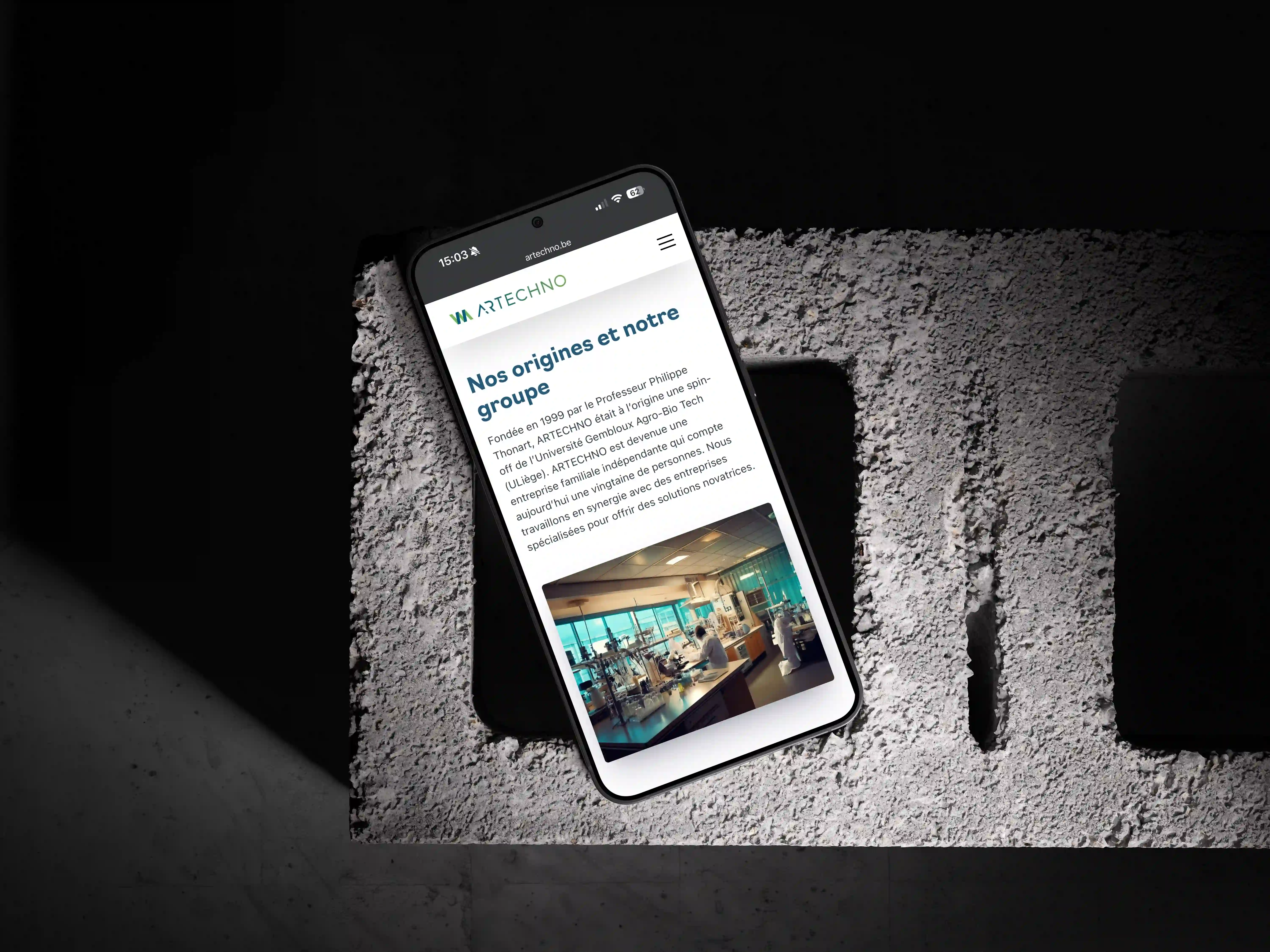 Entreprise belge pionnière dans la production de micro-organismes, ARTECHNO a voulu moderniser son image. Refonte du site web et repositionnement visuel autour de la précision, de l’innovation et de la recherche. Un univers digital sobre et scientifique, fidèle à l’expertise de la marque.